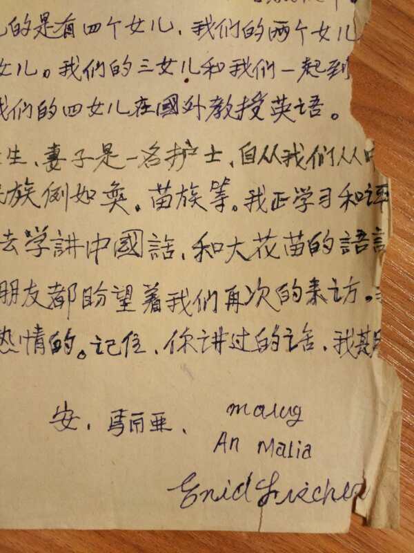 从洒普山苗寨到美国内华达州 ——跨越一个世纪的真挚情谊 龙 芳 我的老家在云南武定县洒普山村,祖辈们从贵州威宁迁徙到滇中已经有一百三十多年了。1904年,基督教传入洒普山,经过几年的努力,1910年底,洒普山初等小学校建设完工,1911年正式对外招收学生入校读书。1921年,洒普山高等小学建成,所设立的“私立恩光小学”成为了滇中苗家的文化摇篮。我父亲于上世纪四十年代中期在这所小学读书,那时,在洒普山总教堂服务的是英国牧师安育林及夫人安师母。1947年,安牧师回美国(安师母是美国人)休假期间不幸因病去世。安师母于1972年去世。不久前,我从父亲的遗物里找到一叠零碎的纸张,里面都是关于洒普山历史的记录以及对安育林牧师及夫人的片段回忆。其中,父亲写的一篇短文吸引了我。 “安牧师在洒普山期间说一口流利的苗语,苗族人很喜欢他和安师母。每年到过节时都去请来吃“杀猪节”的饭菜,我家共请了两次,其中有一次小玛丽亚也在场吃饭。外国人吃饭要用餐巾盖在胸前才吃饭,大人小孩一律那样做。因为她(小玛丽亚)出生在中国,吃饭时人人都用筷子,外国人的小娃娃也学会了用筷子,但是很不熟练,我们在一旁还很好笑哩。每次来吃“杀猪节”,安牧师都端来一碗很好吃的菜。 1947年,安牧师一家要回美国时,那天是星期日,很多苗族信徒来送行,离别时苗族妇女们个个都哭成了泪人。吉普车停在山下公路上。半个世纪过去了,在这漫长的岁月里,我一直没有忘记安牧师一家,洒普山的人民没有忘记。只要走过那间房子,我就想起安牧师一家人,想起安师母在房间里为我们苗族人民看病、拿药、打针。 自从安牧师一家人回美国后就和我们彻底失去了联系,假如不是1996年小玛丽亚写信来,我们还不知道安师母已于1972年去世了。小时候,我有病就去找安师母。安师母不仅为我种“牛痘”打“预防针”,还给我饼干和水果糖吃。至今,我左手臂上还留有安师母种的“牛痘”印记。这位伟大的美国母亲,她在洒普山的公益事业启发了我,通过努力,我长大后也成为了一名医务工作者。” “从1944年到1946年期间,当小学生的我每逢星期六放假时,就到山上放牲畜。春天来临时,这座山上的山茶花开满遍地,特别是有水的沟边最多。一旦走近花开的小沟边,就看到一群一群小蜜蜂飞来飞去采蜜糖。周围还有各种各样的野花也很多。 我看到山茶花开得很好看,我想,安师母也一定会喜欢这些好看的粉红色、紫色和白色花朵,虽然在她家的花园里已经有各种花,多得看也看不完。有一次放牛途中,我就把各种各样的山茶花采了一捆带回去,试一试安师母喜欢不喜欢。 第二天是星期天,我把花带到牧师住房前。因为那时候木板栏杆门不允许苗族小娃娃随便进去的,我只好在门外等着,我知道安牧师和安师母一定会出来去做礼拜。不久,我听见高跟鞋的响声了,心想:肯定是安师母出来了。我站在门栏外递给安师母后拔腿就往回跑去,也没有问喜不喜欢这些花,就连安师母都没有看准是哪一个小娃娃送给她的花。” 我看到不善表达的父亲在晚年写下了这些朴实的文字,内心很难过。自幼丧母的父亲在洒普山渡过了饥寒交迫的童年,因为家境极度贫困,在成长阶段里几乎没有受到过什么特别的关爱,所以,对这位曾给过他关怀的美国母亲产生了近乎神圣的情感并因此灌输了一种精神力量,以至于后来成为药剂师的父亲在职业生涯里无私地资助贫困就医者。 1995年,安牧师的女儿安▪玛丽亚到访洒普山。2000年4月,安牧师的儿子安▪约翰重返洒普山。相隔半个世纪之后,父亲和远在美国内华达州的安▪玛丽亚有了情感真挚的书信往来。 这里节选自小玛丽亚给父亲的信:“能再次来到中国是最让人激动的事,我们很遗憾的是不能和我们的朋友呆在一起时间再长一些。如果我们下次再来的话,我一定让你知道。我的父亲在死前几个月,曾打算到中国来,因为我母亲不能再到中国来。她死于1972年,生前她从没有忘记苗族人民。我们一直保存着村子里和很多朋友的照片。如果你喜欢,我很乐意寄一些照片来。 我大学毕业后成为一名小学教师,我已经62岁了,但我一直喜欢教孩子。我的丈夫做中学老师很多年了,但他现在是一个基督教牧师。我们结婚三十年了,我们很有福气的是有四个女儿,我们的两个女儿已经结婚并且有了一个儿子和一个女儿。我们的三女儿和我们一起到中国来,并且对这次访问很感兴趣,我们的四女儿在国外教授英语。 我很高兴地听说你是一名医生,妻子是一名护士。自从我们从中国返国后,我一直在研究中国各民族—例如彝、苗族等。我正学习和评价他们的文化和风俗。我很高兴去学习讲中国话和大花苗的语言。 以下节选自父亲给小玛丽亚的信(稿件):“在2000年,我们洒普山村做了一件大事,号召村民们出资出力,群众捐款近4千元人民币,修建了一个永久性的纪念塔石碑。它呈四方形状,内容有1922年的“永垂不朽”、“世纪溯源”、“日月记事纪念碑”,并用规范苗文刻写。叙述了十九世纪末二十世纪初,西方基督教文化传入洒普山的历史记录。石碑上刻有伯格理牧师两次到洒普山,以及澳籍牧师葛秀峰和英籍牧师安育林的事迹。洒普山作为滇中苗族较为集中之地,自从建了学校后,培养了很多苗族老师、传道员,社会活动家。乃至后来的苗族牧师、工程师、医师、