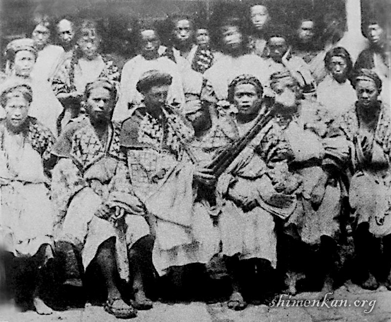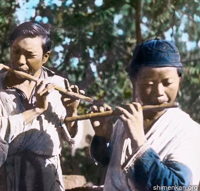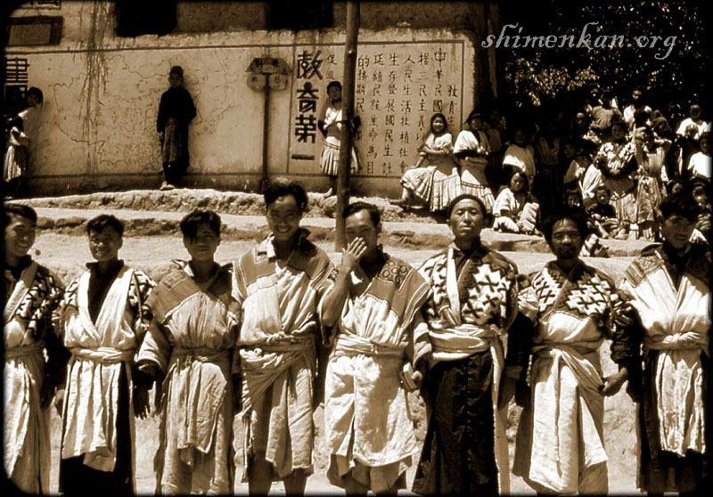 身着苗装的柏格理吹着芦笙,与部分早期的苗族寻访者在一起。