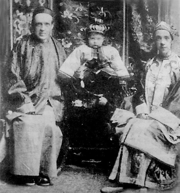 塞缪尔·柏格理和他的夫人埃玛·韩素音。他们于1891年在重庆结婚。1894年长子塞姆·柏格理在昭通出生,他们都身着中式服装,使用着中式的家具。看得出,为了溶入中国文化,柏格理几乎改变了他自身除容貌之外的一切。