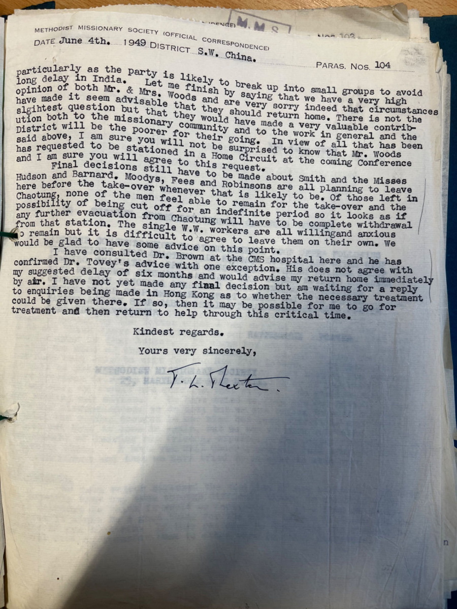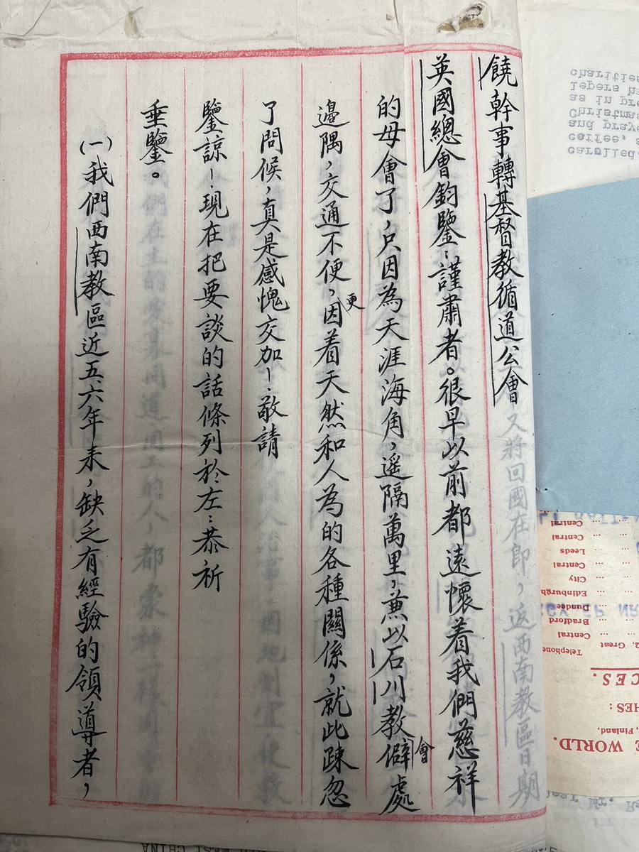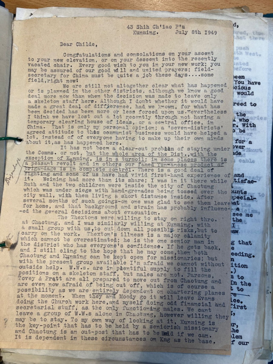1948年石川联会给总会信选主席印书前进运动 1949年6月Thexton给总部昭通撤离及人员