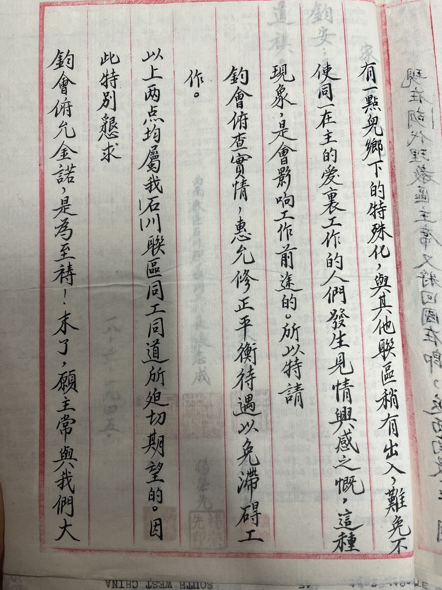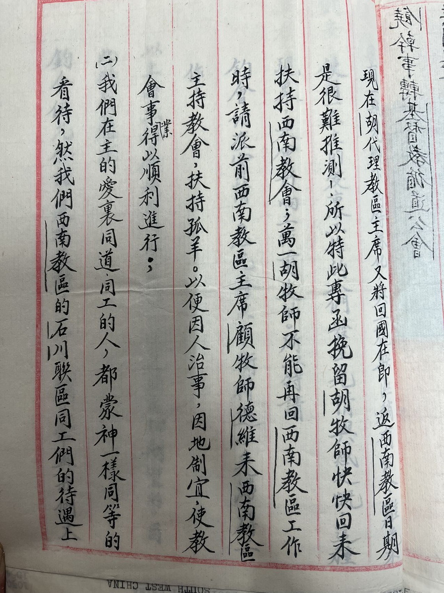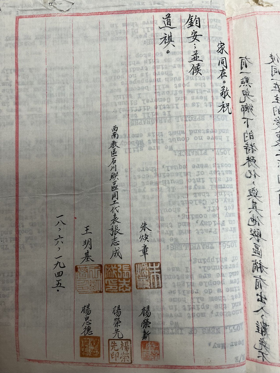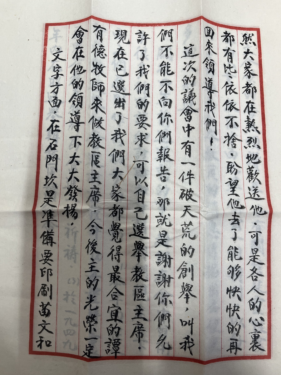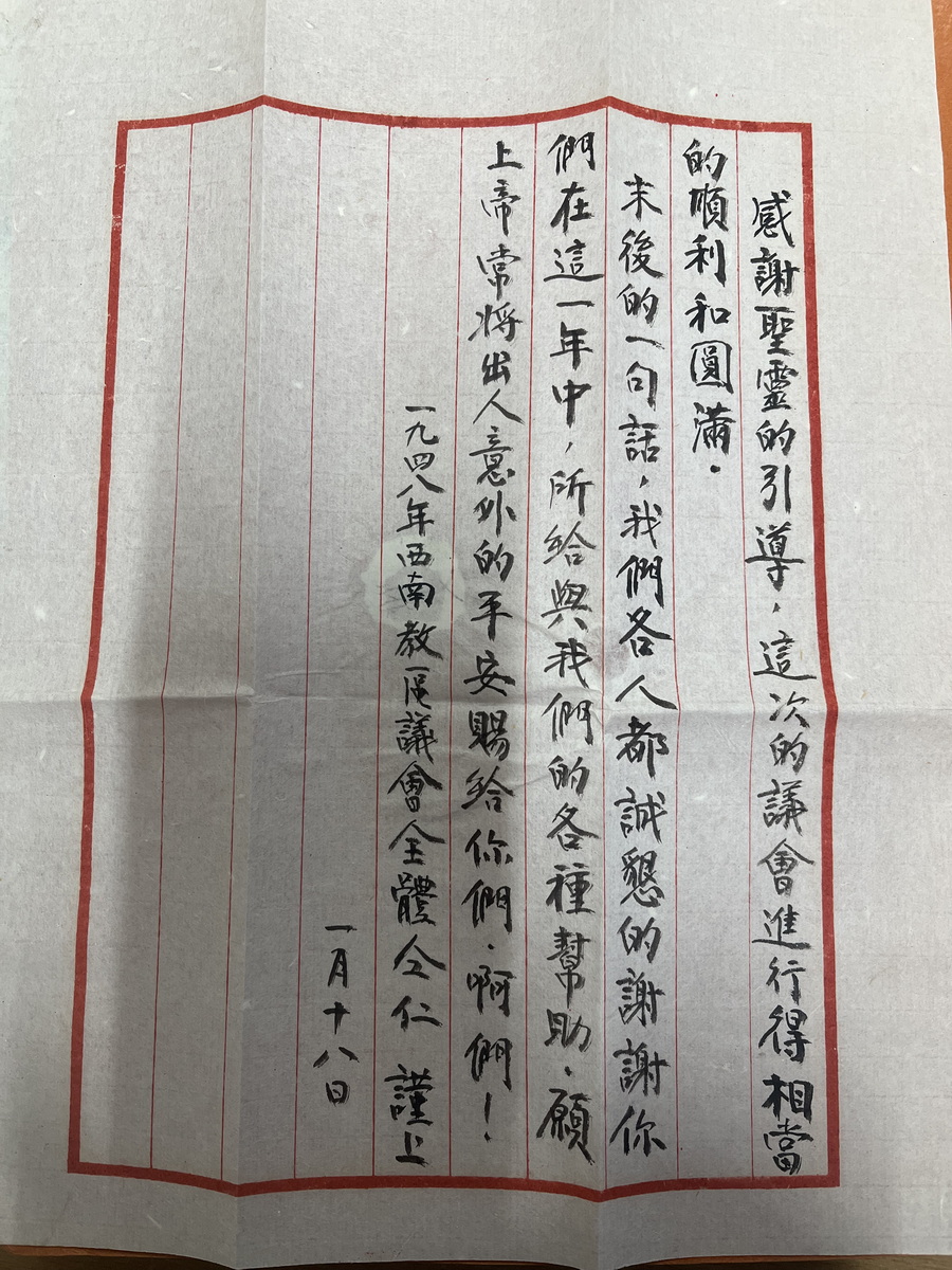 1945年石川联会朱焕章等给总会联名信留洋牧师提高工人待遇 1948年甘铎理信物价昭通地震