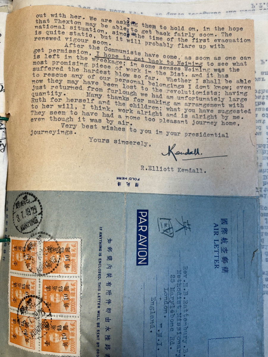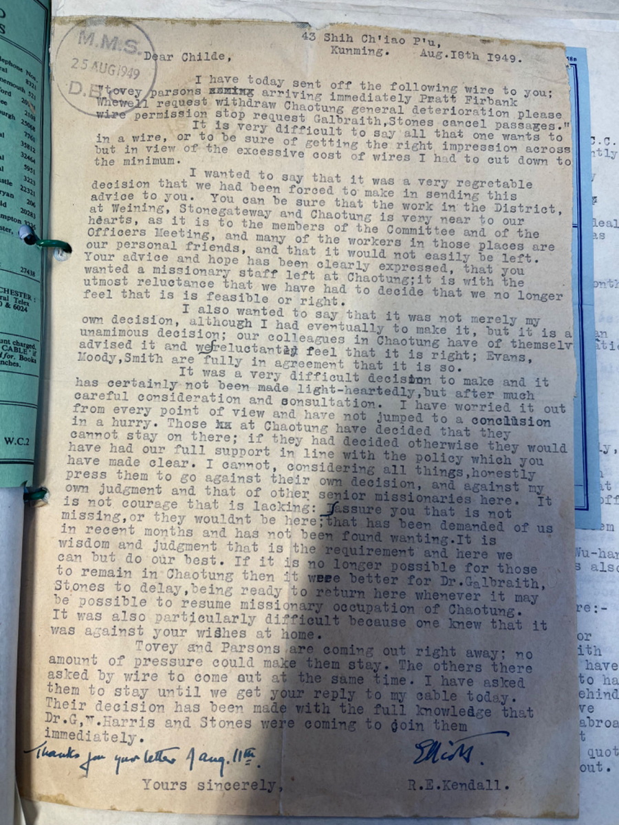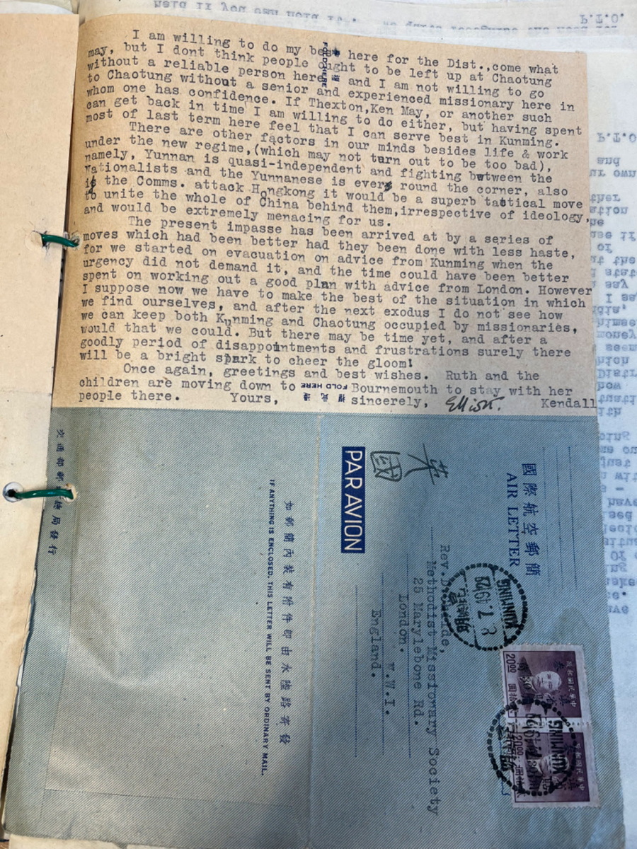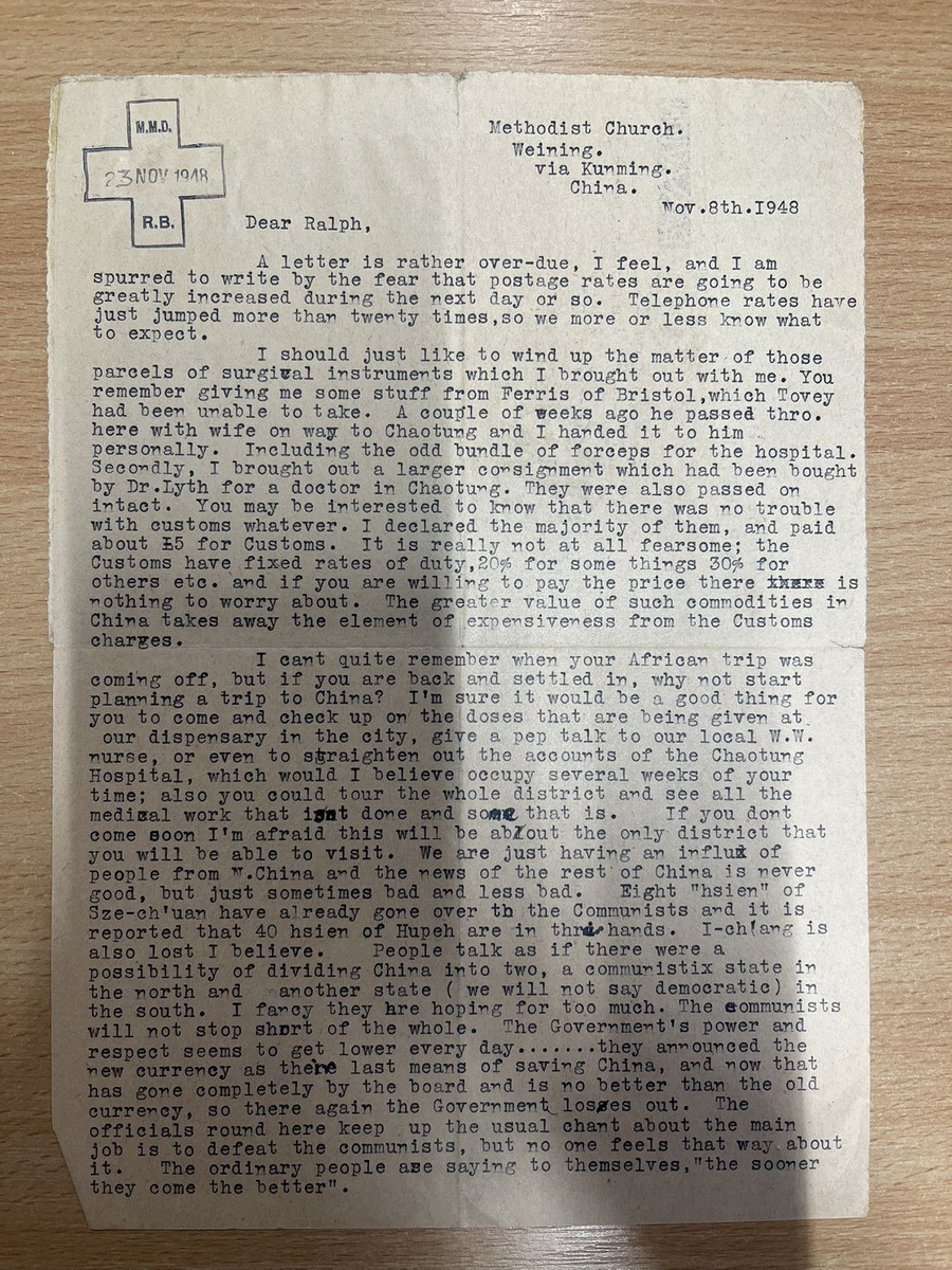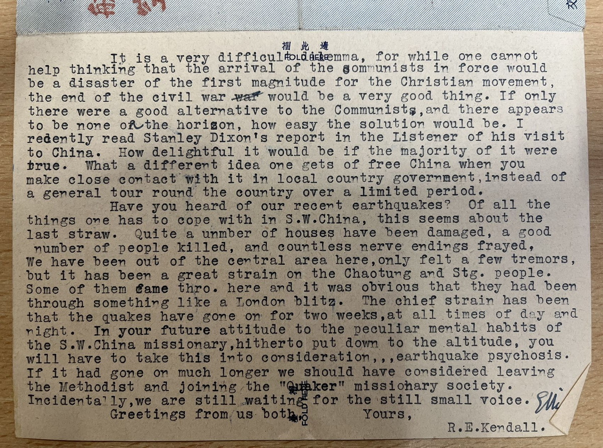 从贵州威宁经昆明到英国伦敦,航空信件写信时间:1948年11月8日寄出时间:1948年11月11日 收到时间:1948年11月23日 亲爱的拉尔夫(Ralph Bolton,英国循道会主席): 我觉得这封信已经过期了,不过我担心邮费第二天或这两天将大幅上涨,这促使我写信。电话费刚刚上涨了 20 多倍,所以我们多少有数接下来会发生什么。 我只想把我带出来的那几包外科手术器械的事情了结了。你记得吧,你给了我一些东西,是自来布里斯托尔的费里斯Ferris的,Tovey (查) 一直没能拿走。几周前他和妻子去昭通路经这里,我亲手把东西交给他了。包括给医院的那捆古怪的钳子。其次,我取出了一批更大的货物,是莱思医生Dr.Lyth为昭通的一位医生购买的。它们也被原封不动地带了下去。 你可能有兴趣知道一下,海关方面没有遇到任何麻烦。我申报了其中的大部分物品,并支付了约 5 英镑的关税。这真的一点都不用担心;海关有固定的税率,有些东西是 20%,有些是 30%,等等。只要你愿意付钱,就完成没有什么可担心的。这类物品在中国的价值更高,抵消了海关收取高昂费用的因素。 我不记得你的非洲之行是什么时候结束,但如果你已回来,那为什么不开始计划来中国的旅行呢?我相信,如果你能来检查一下我们在城里的药房正在发放的药品,给我们当地的护士做一次鼓舞士气的讲话,甚至清理一下昭通医院的账目,这对你来说都是一件好事,我相信这会让你花上好几个星期的时间。你也可以走访一下整个地区,全面考察所有医疗事工,一些地方已经进行,有的还没有开展。如果你不尽快来的话,恐怕这里将会是你唯一能参观的地区了。 我们这里刚刚有一批从北面过来的人,他们带来中国其它地方的消息,从来都不是什么好消息,只是有的是坏消息,有的不那么坏而已。四川的八个县已经到了共产党手里,据说湖北的四十个县也在共产党手里了。我相信宜昌也失去了。人们说起好像有一种可能,把中国一分为二,北方是共产主义的,南方是另一个(我们不会认为是民主的)。我感到他们希望的太多了。共产党不会在整体上停滞不前的。政府的权力和尊重似乎一天比一天低……他们宣布新货币是他们拯救中国的最后手段,现在这完全已经过时了,并不比旧货币更好,所以政府又一次输掉了。这里的官员们仍旧像往常一样唱高调喊口号,主要工作就是打败共产党,但没有人感到是那样的。老百姓对自己说:“他们来得越早越好。” 这是一个非常棘手的两难困境,因为虽然人们不禁会想,共产党的到来对基都运J动来说将是一场巨大的灾难,但内战的结束将是一件非常好的事情。除非有一个对共产党来说不错的替代方案,那么解决起来多容易,但看来是一个也没有。我最近在《听众》杂志上读到了Stanley Dixon访问中国的报道。如果大部分都是真的,那该多好啊。当你到了地方上与政府有密切的接触,而不是在有限的时间里全国各地走马观花,你会对自由的中国产生非常不一样的看法。 你听说过我们最近的地震了吗?中国西南地区的人们必须要应付的所有事情中,这似乎是压垮他们的最后一根稻草。相当数量的房屋遭到破坏,许多人丧生,各种担惊受怕更是不计其数。我们已经离开这里的中心区,只感觉到了几次震动,但这对于昭通和石门坎的人们来说是一种巨大的压力。他们中有一些人来到这里,很明显,他们经历的是像伦敦闪电战一样的惨烈状况。最让人紧张的是地震,已经持续两个星期了,随时随刻不分昼夜。在未来的你对于西南传J 士特殊精神习惯的态度中,你一定要把这点考虑进去,地震性精神病,到目前为止还算平定。如果它继续再这么持续下去的话,我们应该会考虑离开循道会加入贵格会了(贵格会Quaker,中文有译震颤者,(听到了上头来的话而)震颤发抖的意思;他这是幽默,指持续地震让人颤抖索性去做震颤者会吧)。顺便说一句,我们仍在等待仍然微小的声音(这话应该是句双关)。 我们俩都问候你。 甘铎理 R.E.Kendall 1948年石川联会给总会信选主席印书前进运动