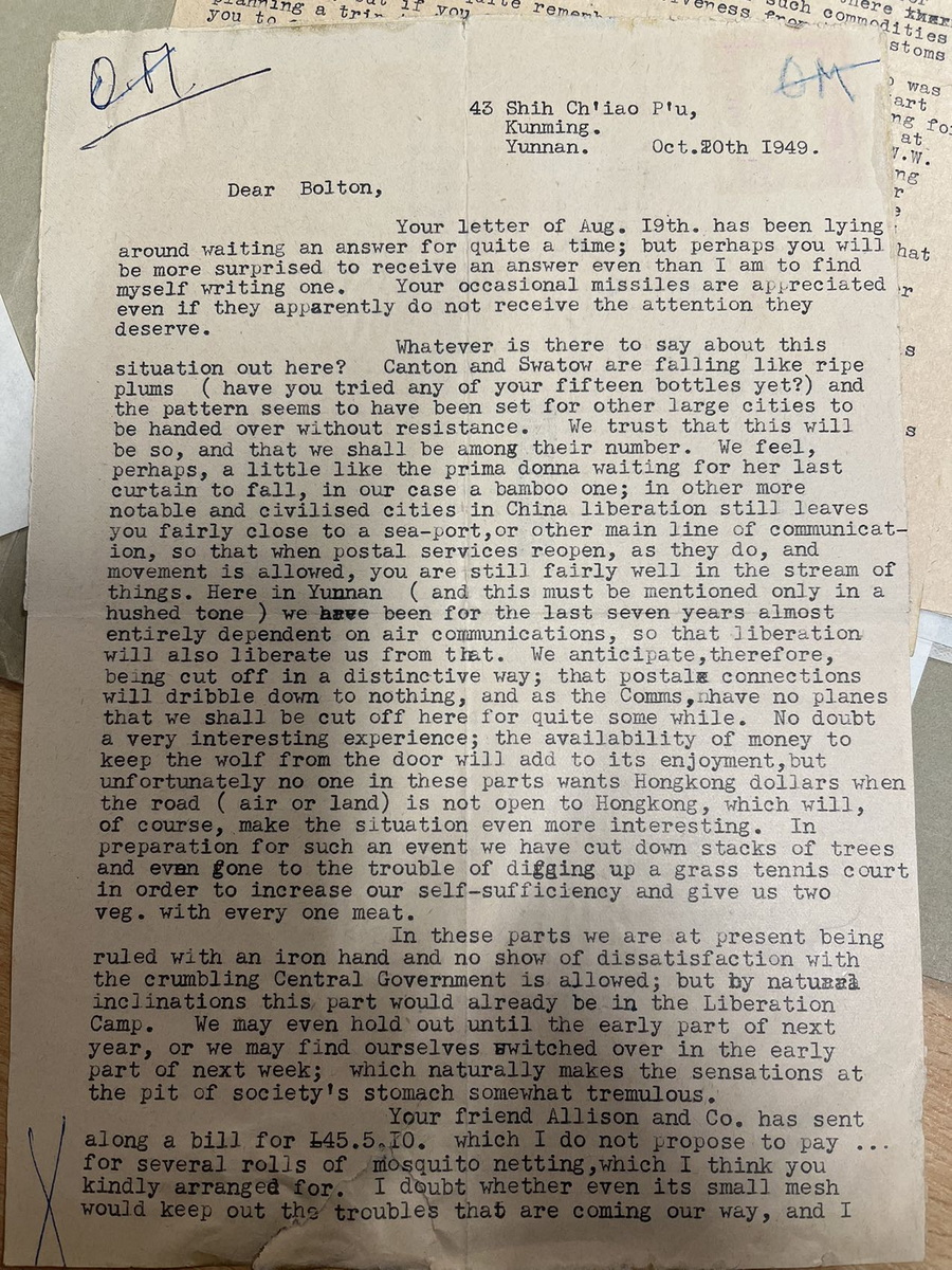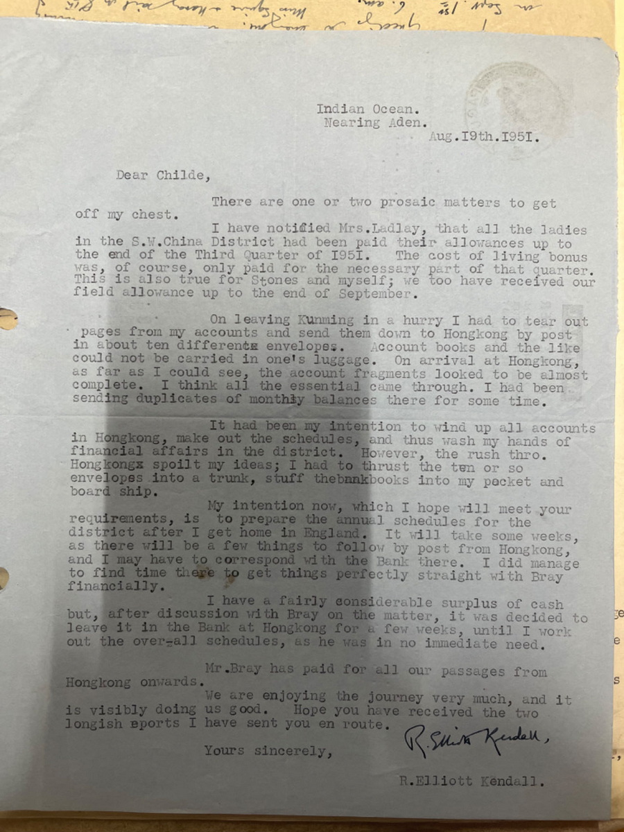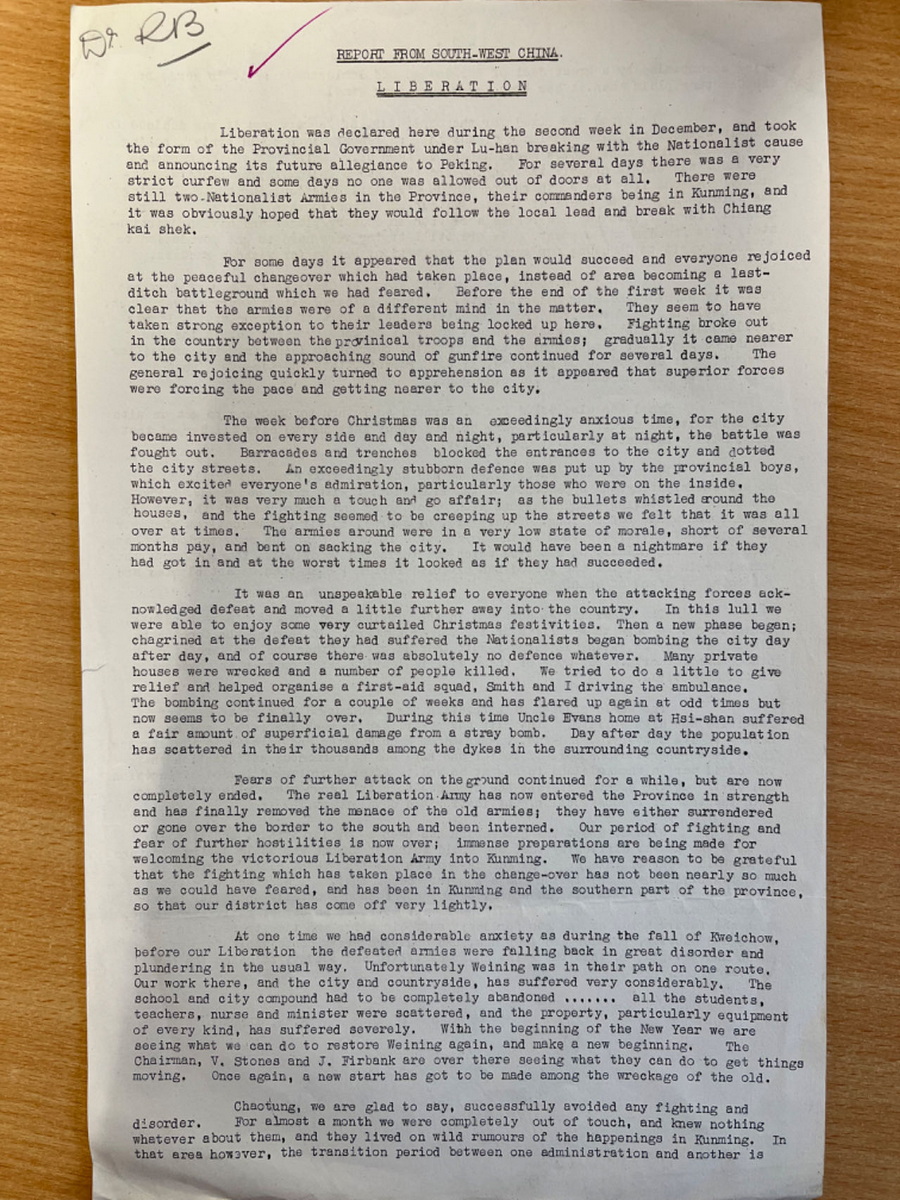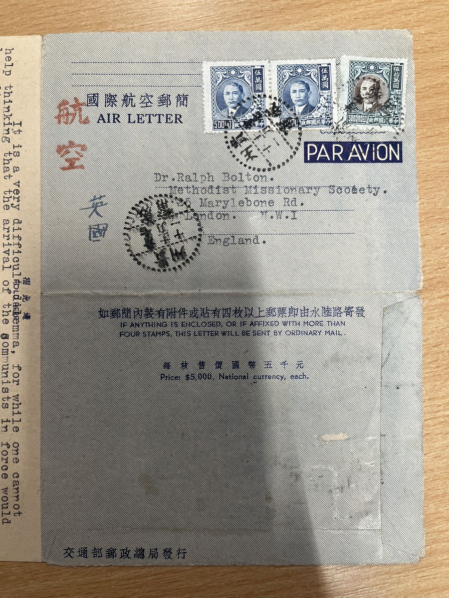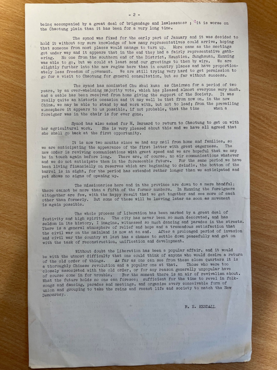 从贵州威宁经昆明到英国伦敦,航空信件写信时间:1948年11月8日寄出时间:1948年11月11日 收到时间:1948年11月23日 亲爱的拉尔夫(Ralph Bolton,英国循道会主席): 我觉得这封信已经过期了,不过我担心邮费第二天或这两天将大幅上涨,这促使我写信。电话费刚刚上涨了 20 多倍,所以我们多少有数接下来会发生什么。 我只想把我带出来的那几包外科手术器械的事情了结了。你记得吧,你给了我一些东西,是自来布里斯托尔的费里斯Ferris的,Tovey (查) 一直没能拿走。几周前他和妻子去昭通路经这里,我亲手把东西交给他了。包括给医院的那捆古怪的钳子。其次,我取出了一批更大的货物,是莱思医生Dr.Lyth为昭通的一位医生购买的。它们也被原封不动地带了下去。 你可能有兴趣知道一下,海关方面没有遇到任何麻烦。我申报了其中的大部分物品,并支付了约 5 英镑的关税。这真的一点都不用担心;海关有固定的税率,有些东西是 20%,有些是 30%,等等。只要你愿意付钱,就完成没有什么可担心的。这类物品在中国的价值更高,抵消了海关收取高昂费用的因素。 我不记得你的非洲之行是什么时候结束,但如果你已回来,那为什么不开始计划来中国的旅行呢?我相信,如果你能来检查一下我们在城里的药房正在发放的药品,给我们当地的护士做一次鼓舞士气的讲话,甚至清理一下昭通医院的账目,这对你来说都是一件好事,我相信这会让你花上好几个星期的时间。你也可以走访一下整个地区,全面考察所有医疗事工,一些地方已经进行,有的还没有开展。如果你不尽快来的话,恐怕这里将会是你唯一能参观的地区了。 我们这里刚刚有一批从北面过来的人,他们带来中国其它地方的消息,从来都不是什么好消息,只是有的是坏消息,有的不那么坏而已。四川的八个县已经到了共产党手里,据说湖北的四十个县也在共产党手里了。我相信宜昌也失去了。人们说起好像有一种可能,把中国一分为二,北方是共产主义的,南方是另一个(我们不会认为是民主的)。我感到他们希望的太多了。共产党不会在整体上停滞不前的。政府的权力和尊重似乎一天比一天低……他们宣布新货币是他们拯救中国的最后手段,现在这完全已经过时了,并不比旧货币更好,所以政府又一次输掉了。这里的官员们仍旧像往常一样唱高调喊口号,主要工作就是打败共产党,但没有人感到是那样的。老百姓对自己说:“他们来得越早越好。” 这是一个非常棘手的两难困境,因为虽然人们不禁会想,共产党的到来对基都运J动来说将是一场巨大的灾难,但内战的结束将是一件非常好的事情。除非有一个对共产党来说不错的替代方案,那么解决起来多容易,但看来是一个也没有。我最近在《听众》杂志上读到了Stanley Dixon访问中国的报道。如果大部分都是真的,那该多好啊。当你到了地方上与政府有密切的接触,而不是在有限的时间里全国各地走马观花,你会对自由的中国产生非常不一样的看法。 你听说过我们最近的地震了吗?中国西南地区的人们必须要应付的所有事情中,这似乎是压垮他们的最后一根稻草。相当数量的房屋遭到破坏,许多人丧生,各种担惊受怕更是不计其数。我们已经离开这里的中心区,只感觉到了几次震动,但这对于昭通和石门坎的人们来说是一种巨大的压力。他们中有一些人来到这里,很明显,他们经历的是像伦敦闪电战一样的惨烈状况。最让人紧张的是地震,已经持续两个星期了,随时随刻不分昼夜。在未来的你对于西南传J 士特殊精神习惯的态度中,你一定要把这点考虑进去,地震性精神病,到目前为止还算平定。如果它继续再这么持续下去的话,我们应该会考虑离开循道会加入贵格会了(贵格会Quaker,中文有译震颤者,(听到了上头来的话而)震颤发抖的意思;他这是幽默,指持续地震让人颤抖索性去做震颤者会吧)。顺便说一句,我们仍在等待仍然微小的声音(这话应该是句双关)。 我们俩都问候你。 甘铎理 R.E.Kendall 1948年石川联会给总会信选主席印书前进运动